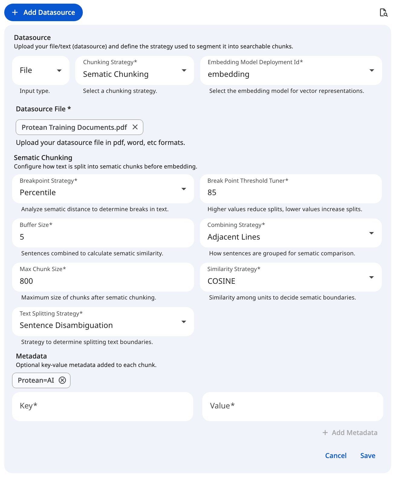 Protean AI provides distinct chunking strategies to optimize how your text or file input is processed before vectorization. Selecting the right strategy and configuring its properties ensures the resulting embeddings are accurately tuned for your specific retrieval use case.