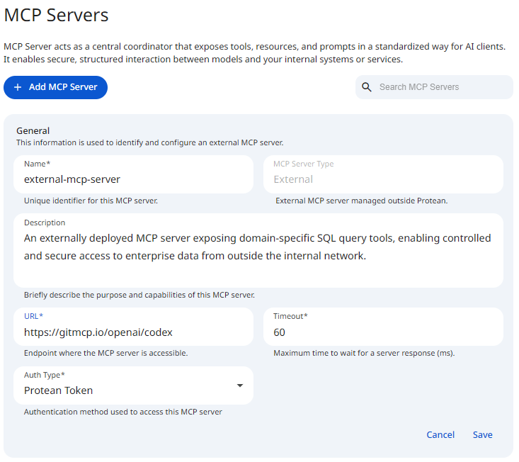 External MCP Servers are managed outside Protean AI and connected via a network endpoint. They allow you to integrate existing MCP-compatible services without migrating them into the platform.