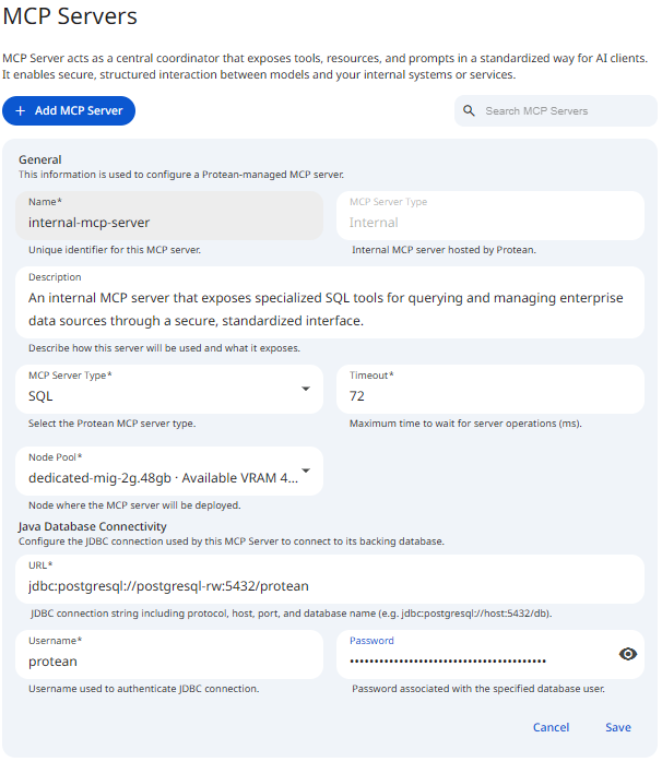 Internal MCP Servers are managed and hosted by Protean AI. Protean AI provides a secure, scalable, and reliable runtime for these servers. At the moment, internal servers support only SQL-backed data access.